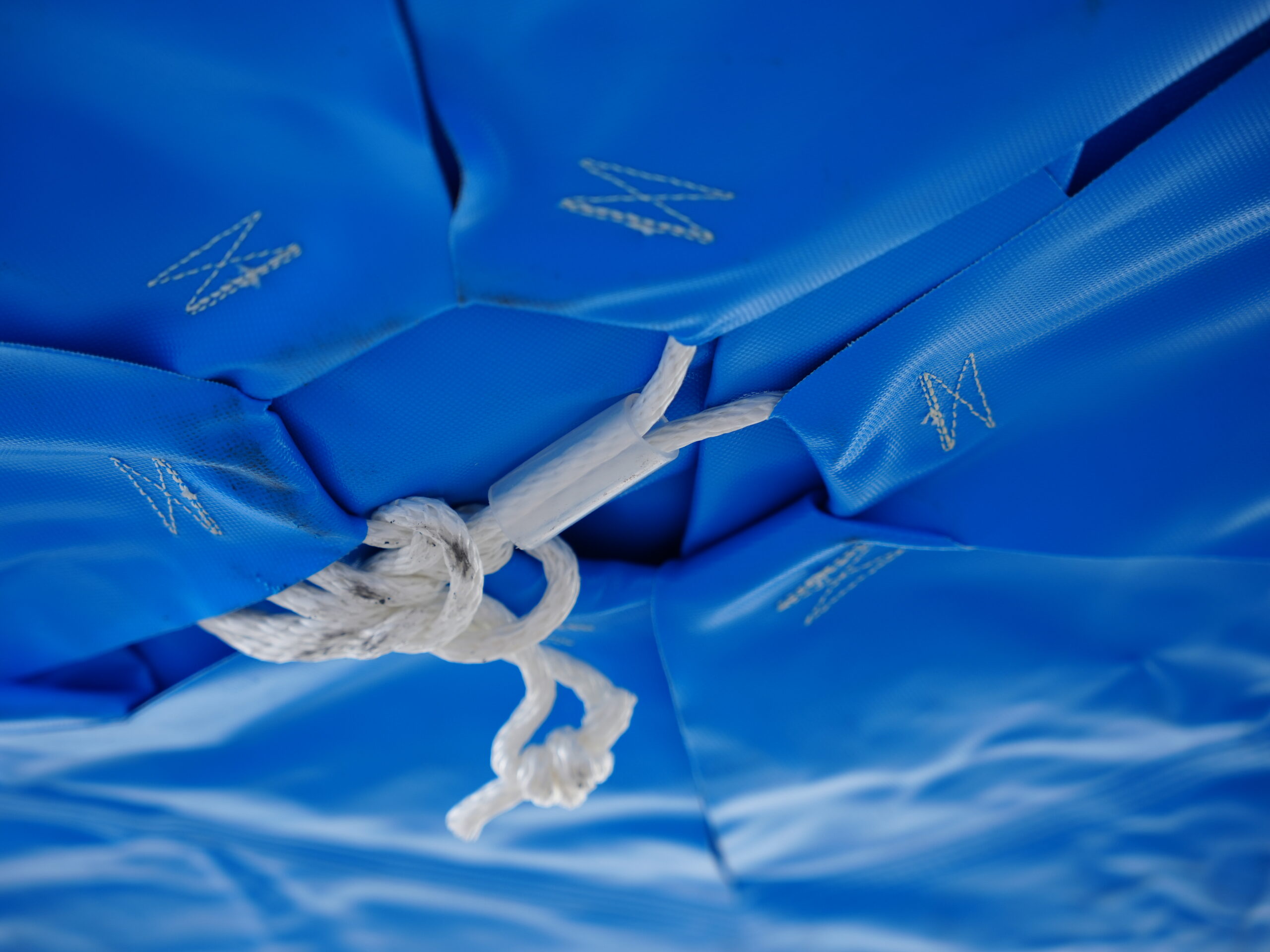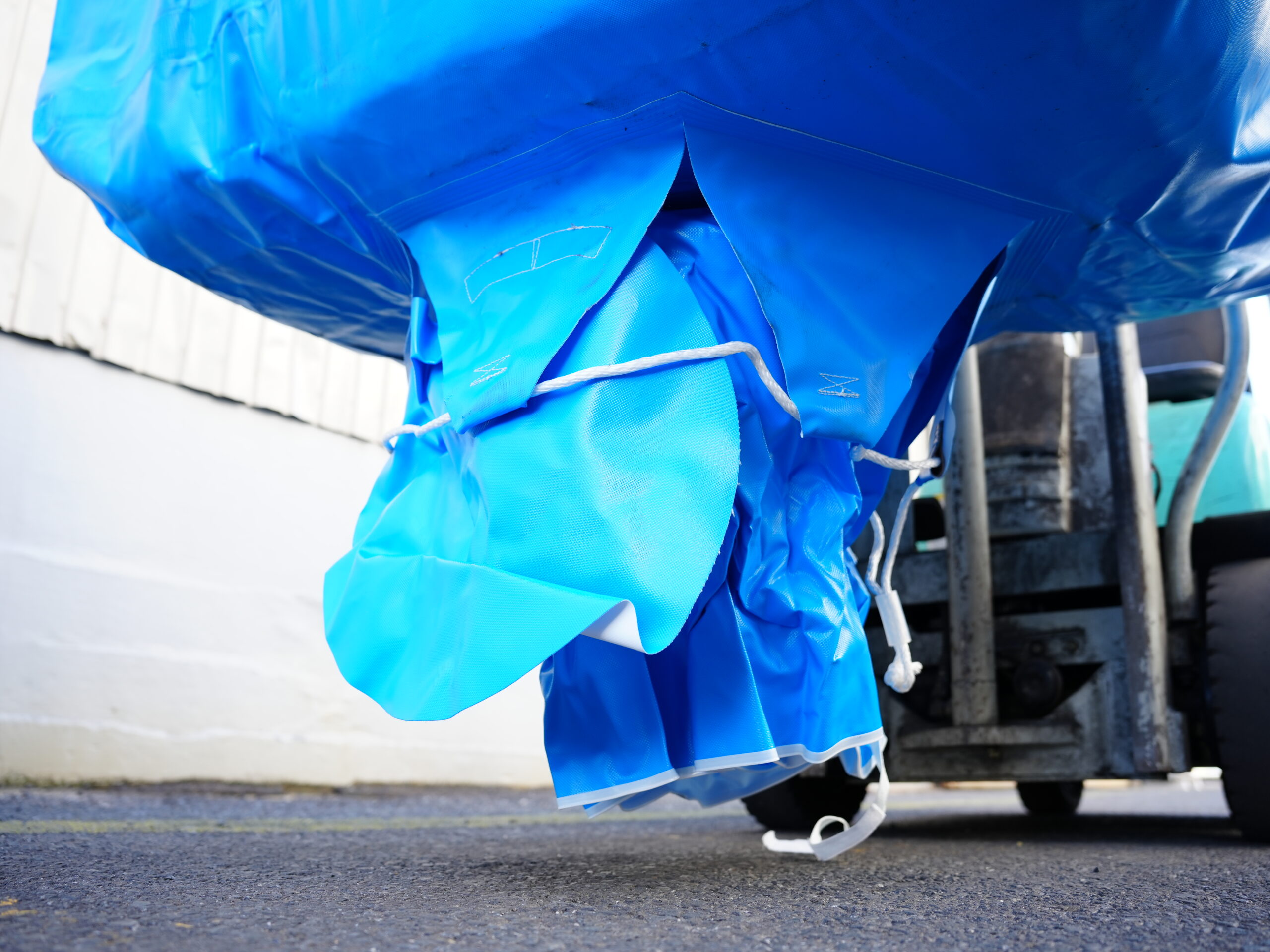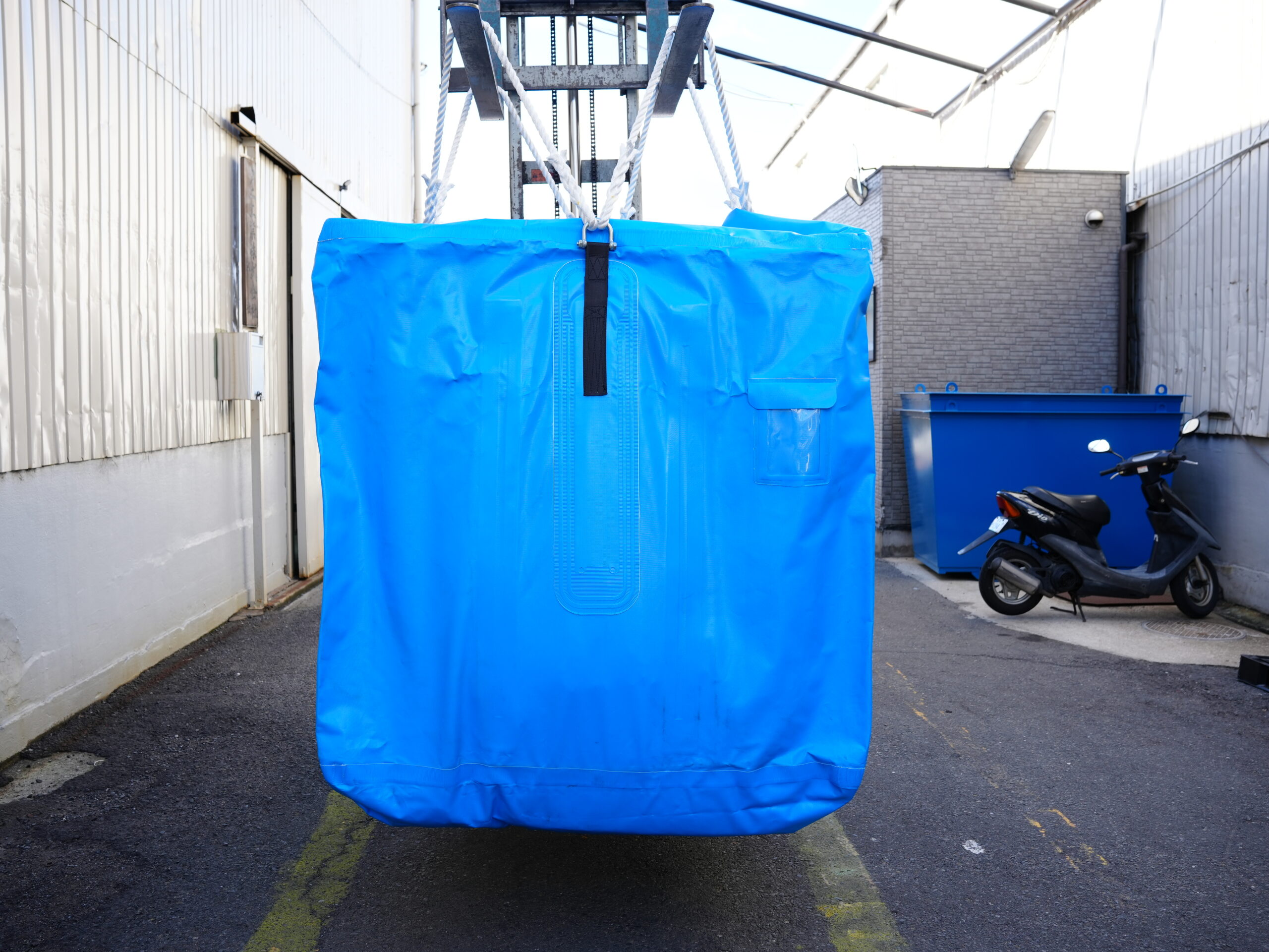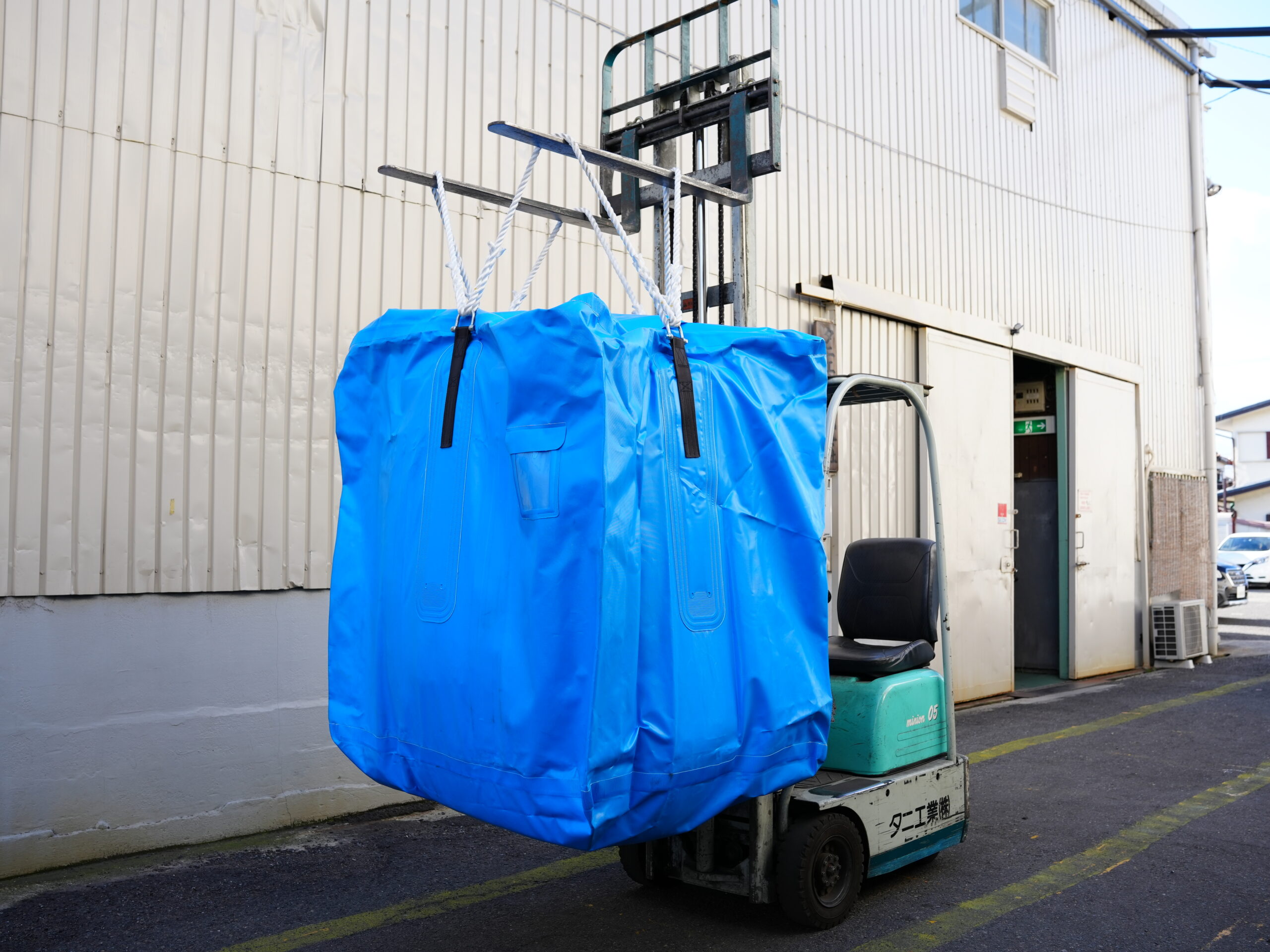 2トンの耐荷重および3年相当の野外設置が可能な高耐候性の大型土のうフレコンバッグに、厚み0.15mmの内袋を装着しました。