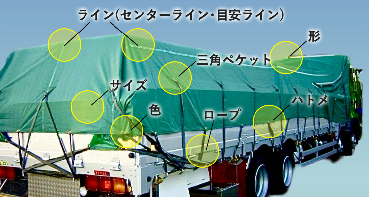 ロープ、三角ペケット、形、サイズ、色、ハトメ、センターライン、ロゴや社名印字などカスタマイズが可能です。トラックシートの見積実績は1000枚以上を誇っておりますので、お客様の各種ご要望を実現することが可能です。お見積りは無料ですのでお気軽にご相談ください。