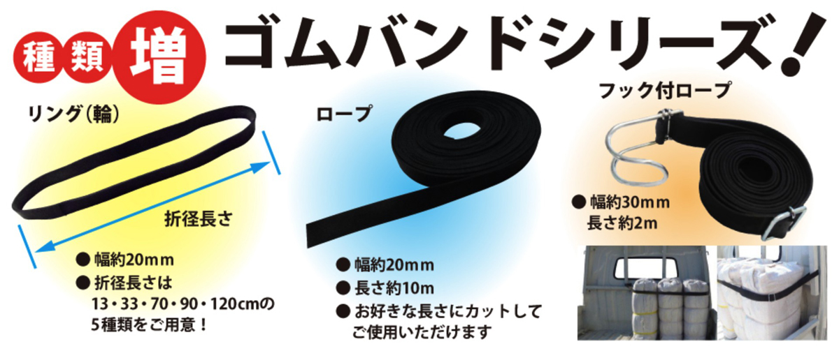 リング(輪)タイプは2cm幅の折径13cm・33cm・70cm・90cm・120cmの5種類、ゴムロープは1本10mなのでお好みの長さににカットしてお使いいただけます。さらに、幅3cm長さ2mのフック付きゴムロープも新登場。当社の隠れた人気商品です。※当社のシートはゴムバンド(折径90cm)が付属しております。(G-10はゴムロープ1本となります)※ゴム製品のため、多少の誤差がありますのでご了承下さい。